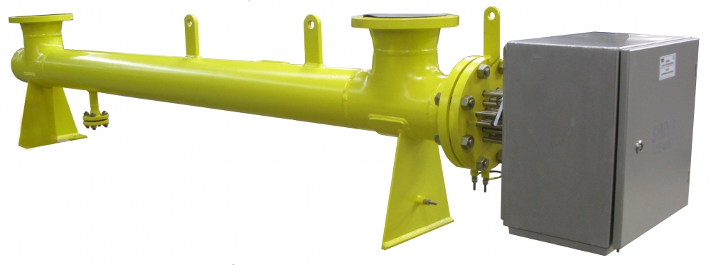 Электронагреватель топливного газа (II 2G Ex ‘de’ IIC T3 Gb) с тиристорной панелью управления для установки в безопасной зоне. В комплект также входят ответные фланцы для каждого патрубка.