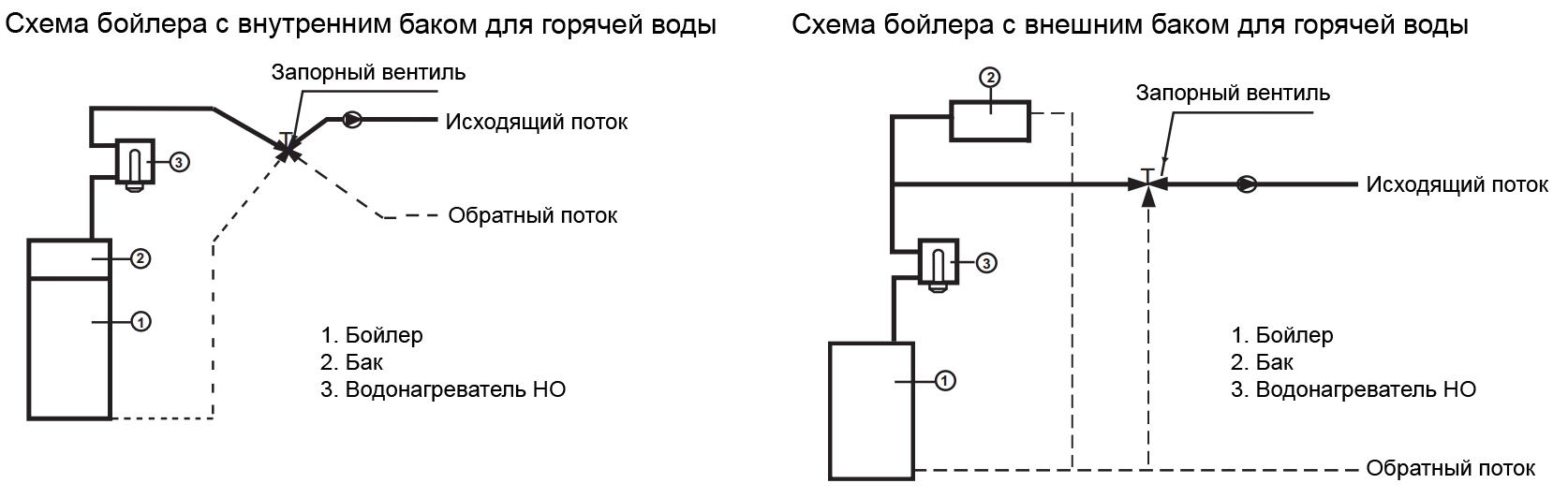 Например, водонагреватели HO работают вместе с водяными бойлерами, в период, когда котлы на жидком топливе отключены и нагрев требуется только для нескольких цилиндров и радиаторов.