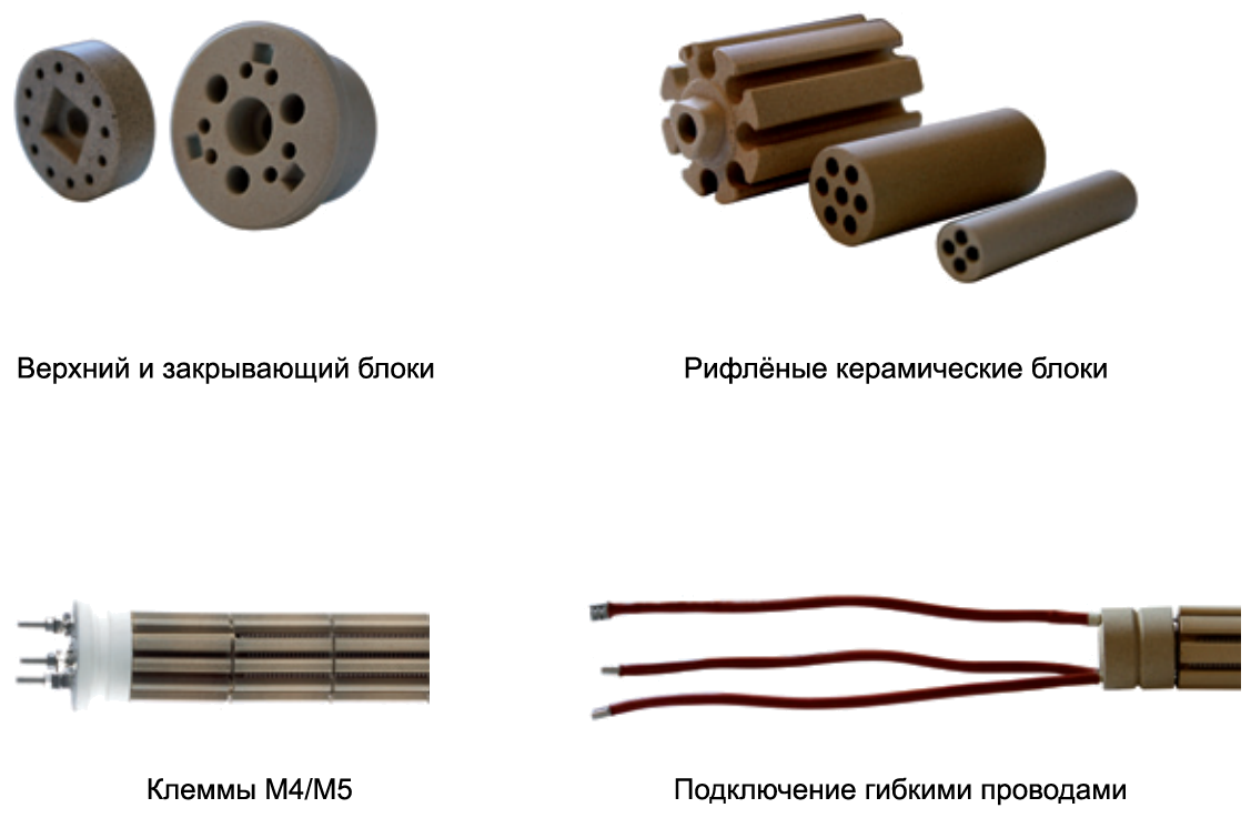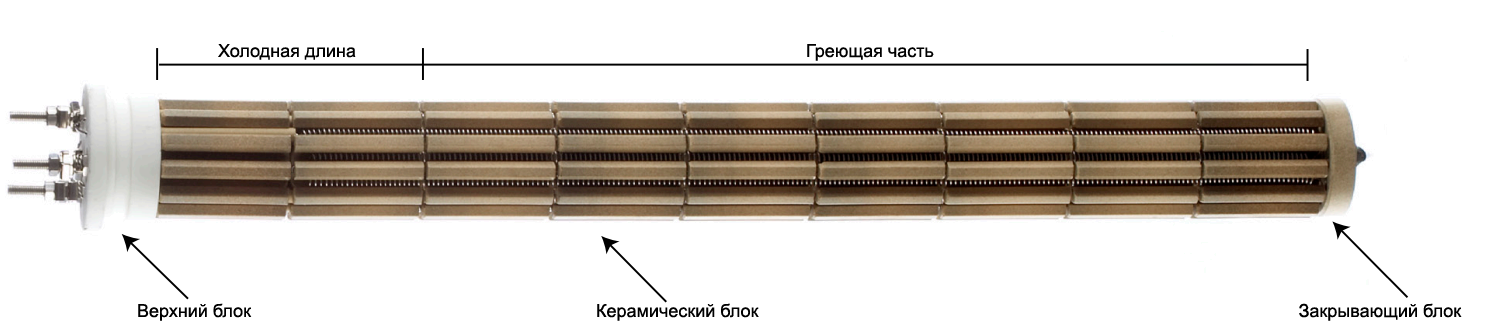 Сами же элементы изготовлены из керамических блоков с нитями накаливания внутри, которые пролегают в продольных боковых канавках. Эти отдельные блоки, независимо от диаметра, имеют различные длины с шагом ±50 мм и могут быть собраны в цельный нагревательный элемент. Благодаря этому решению, длина такого составного элемента может достигать 10-11 метров.
