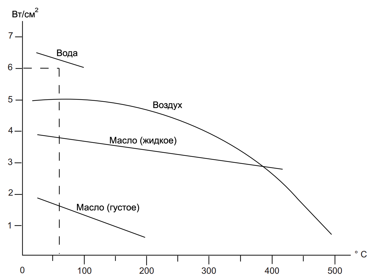 Показывает максимально допустимую удельную мощность (Вт/см²) при различных рабочих температурах. При расчёте важно учитывать способ установки нагревательного элемента и его теплоотдачу.