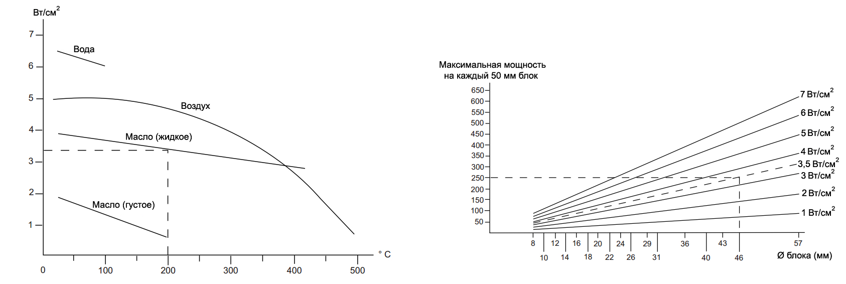 Используйте графики ниже, чтобы рассчитать максимально допустимую мощность на 50 мм длины блока, при оптимальных условиях эксплуатации и при нормальной рабочей температуре.